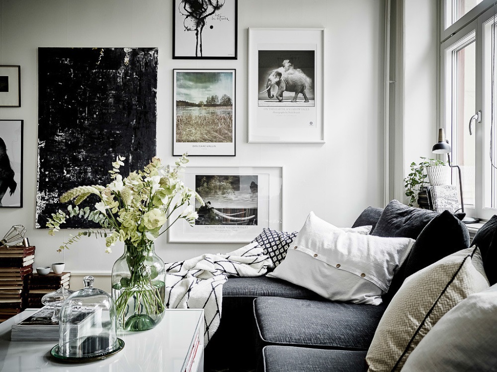 Монохром — это всегда круто. Главное, не переборщить, соблюсти тонкую меру. Дизайнеру, выполнявшему работу в этой шведской квартире-студии, удалось соблюсти баланс цвета. И разбавить белое помещение со светлым текстилем и светлой мебелью графичными черно-белыми постерами и фотографиями. Хочется обратить ваше внимание — абстрактные картины и конкретные фотографии — отличные соседи!