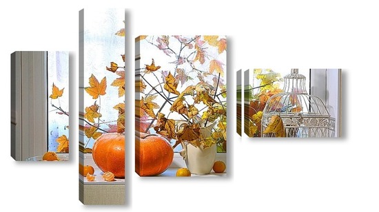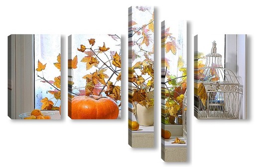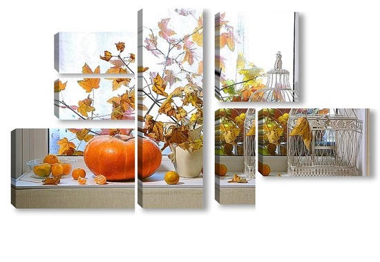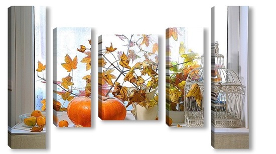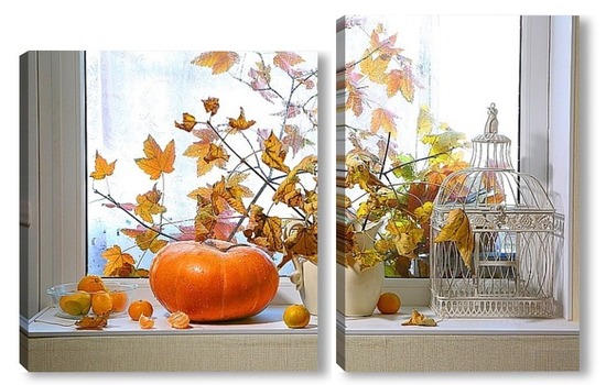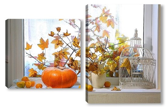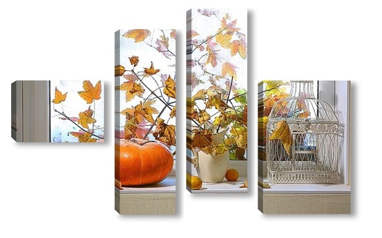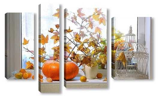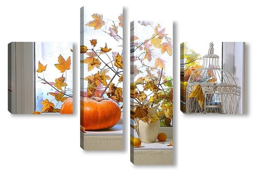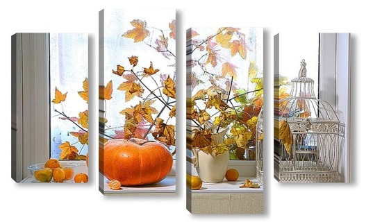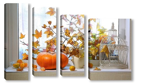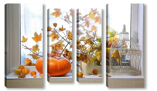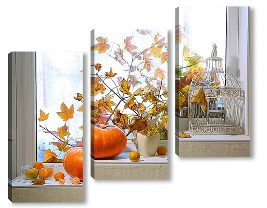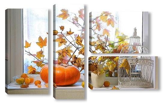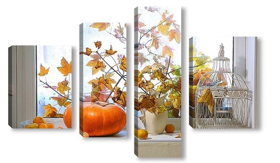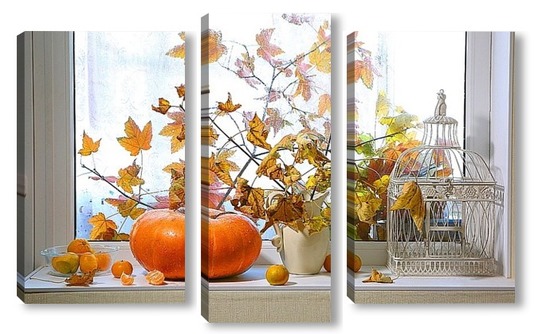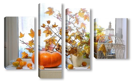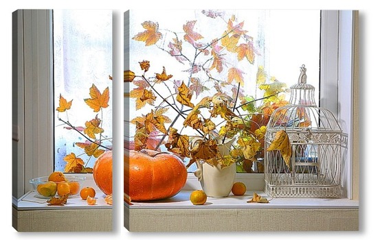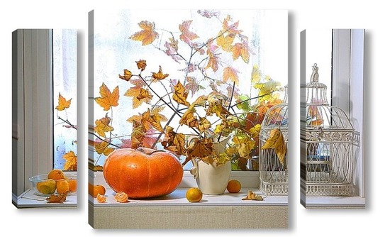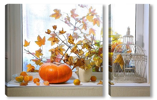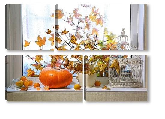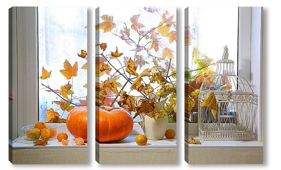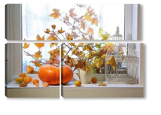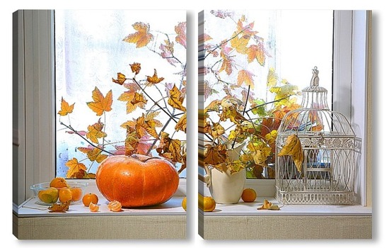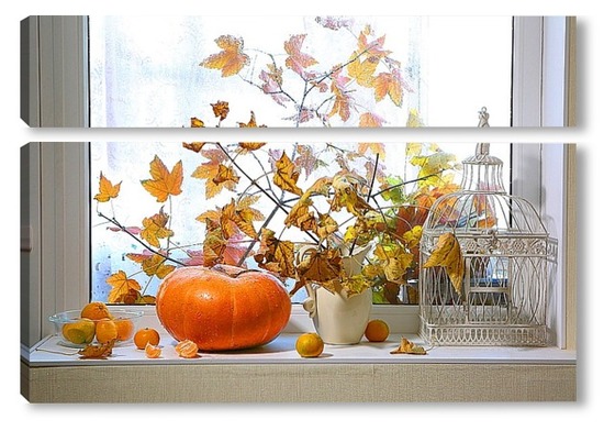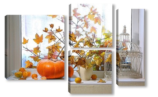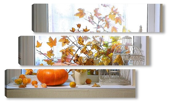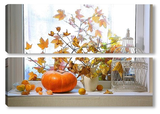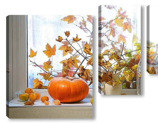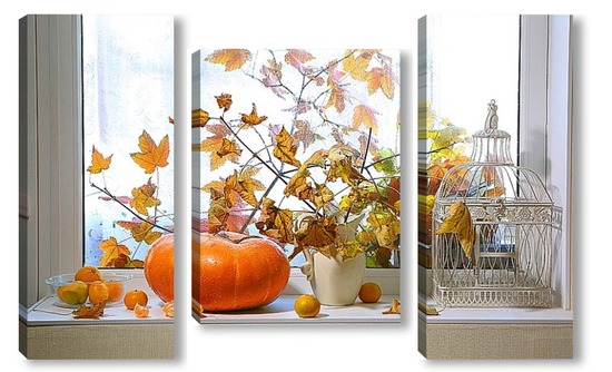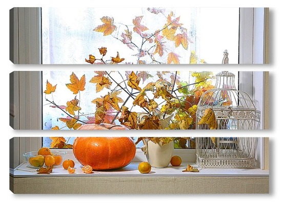 Купить модульную картину натюрморт с тыквой, мандаринами и букетом из кленовых веток с желтыми листьями на фоне дождливого окна