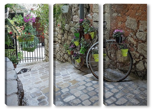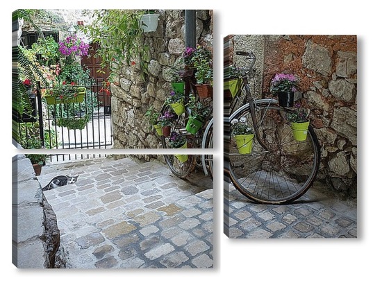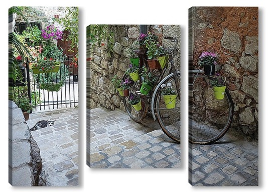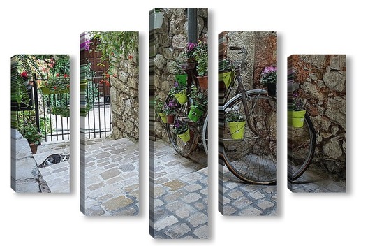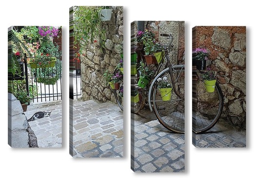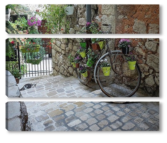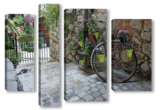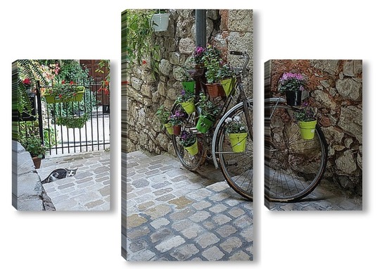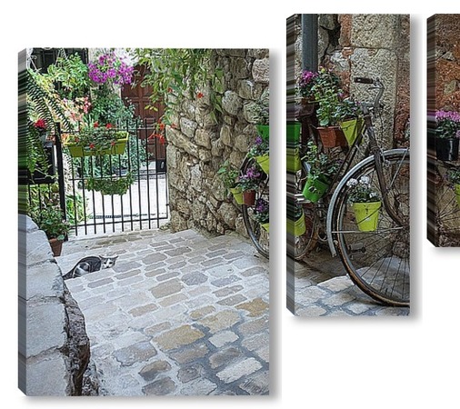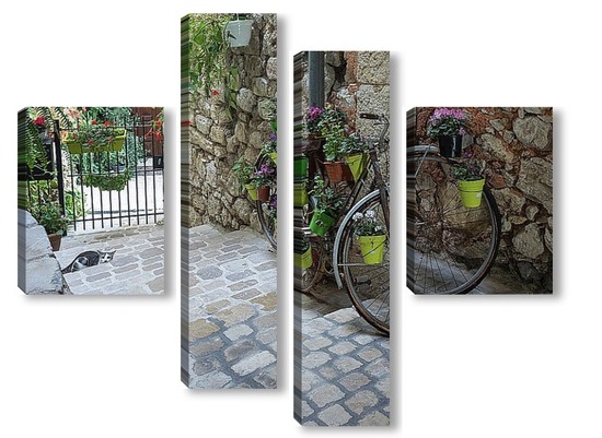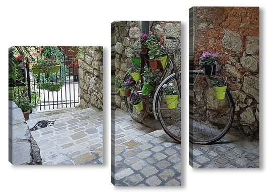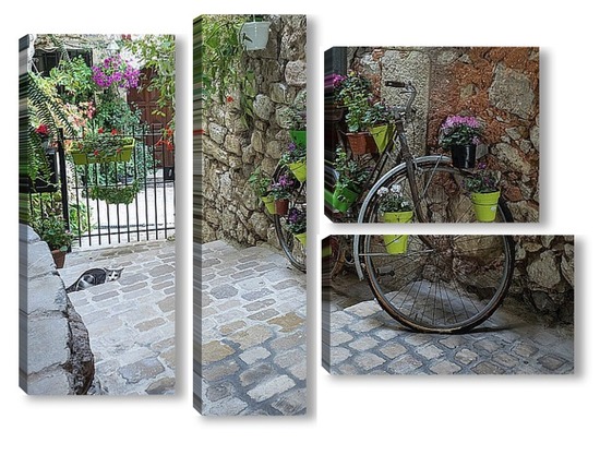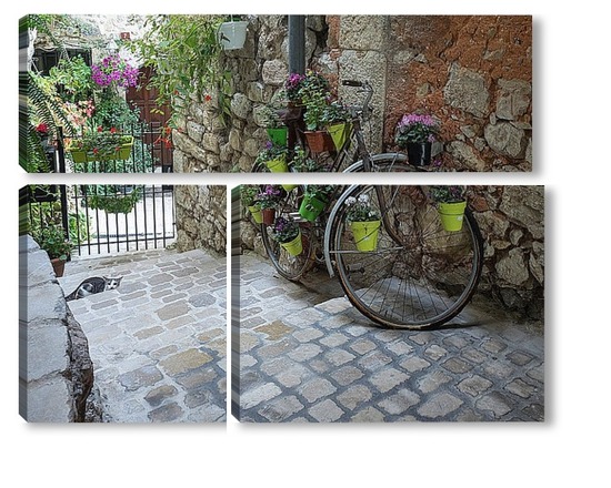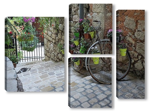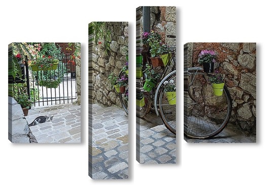 Купить модульную картину Дворик с цветочным велосипедом и испуганным котом