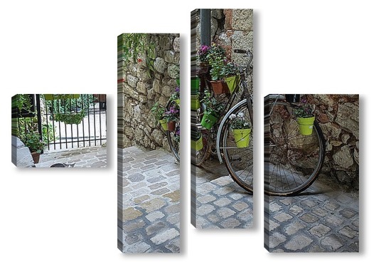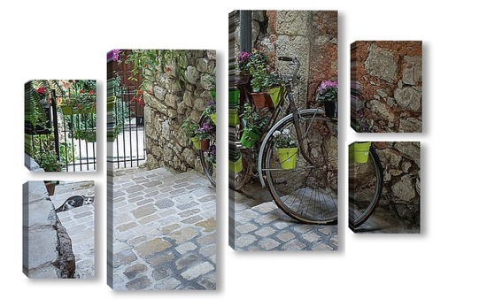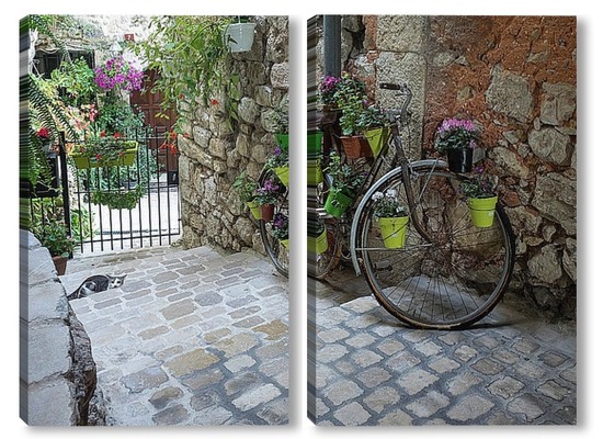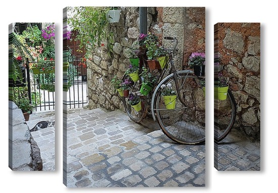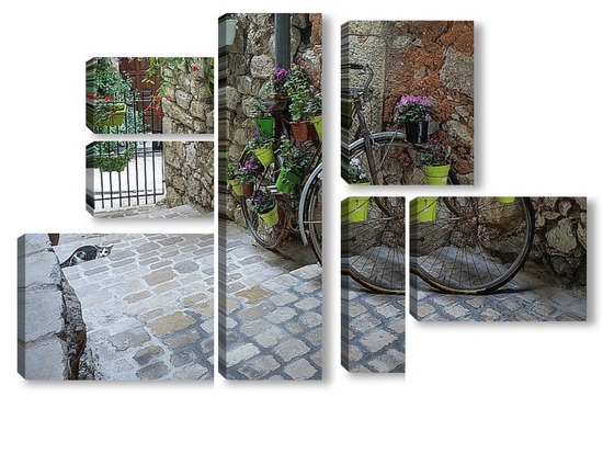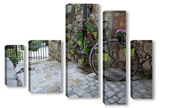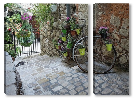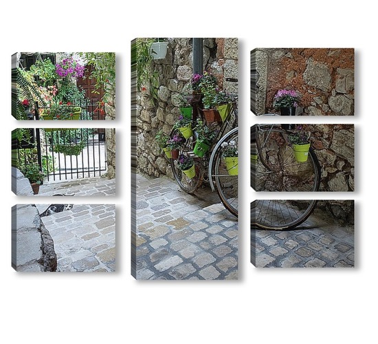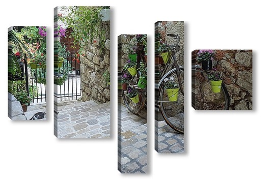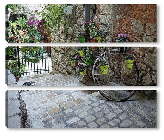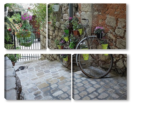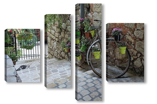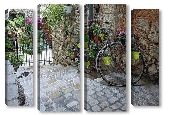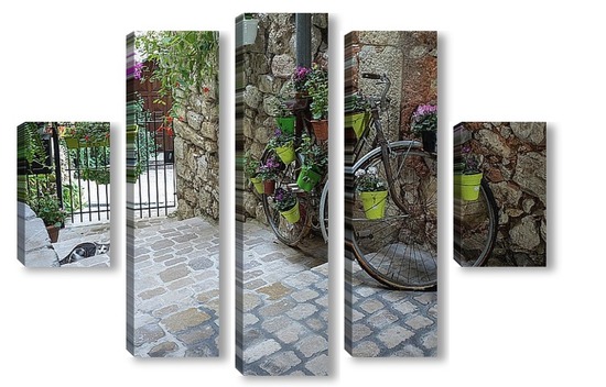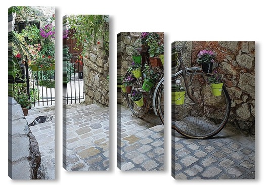 Купить модульную картину Дворик с цветочным велосипедом и испуганным котом