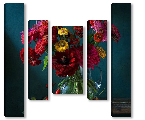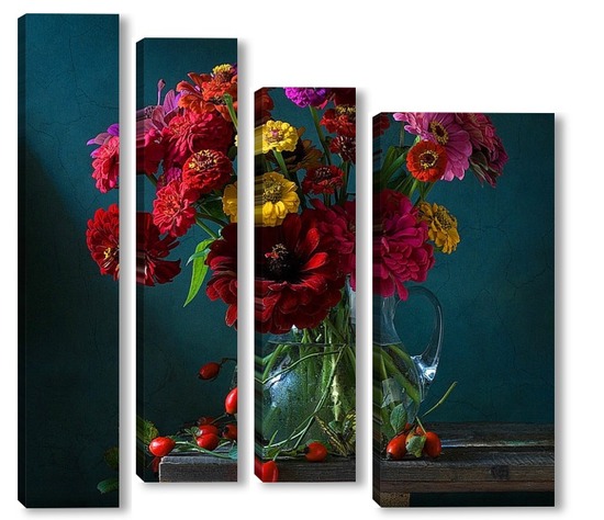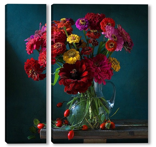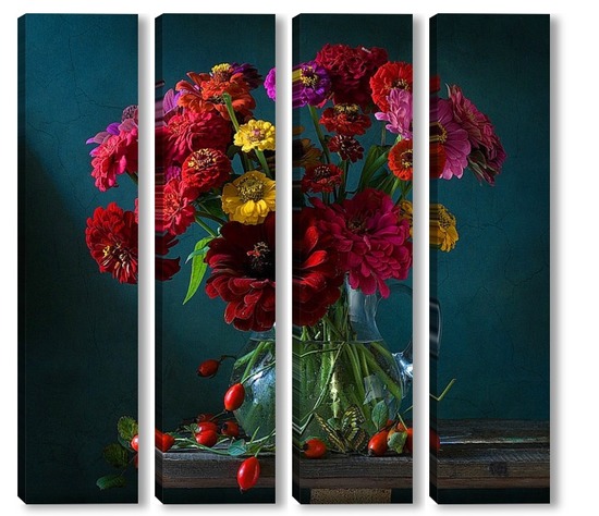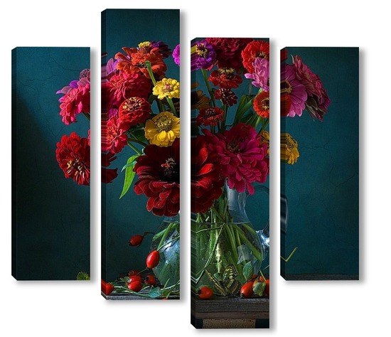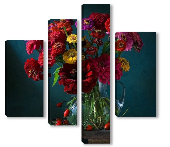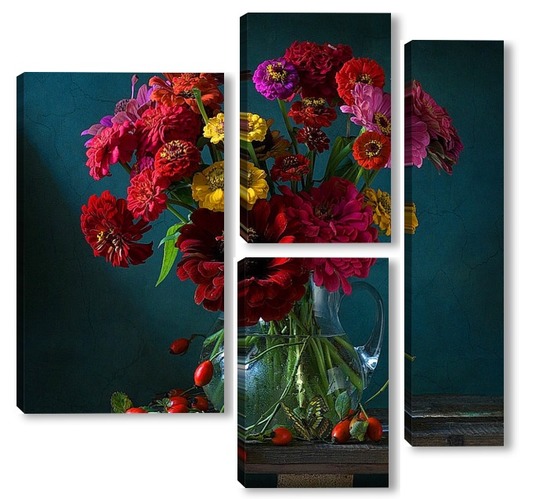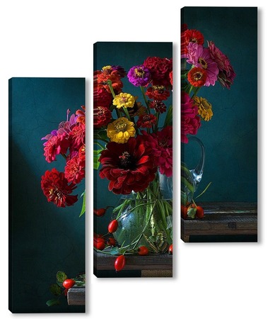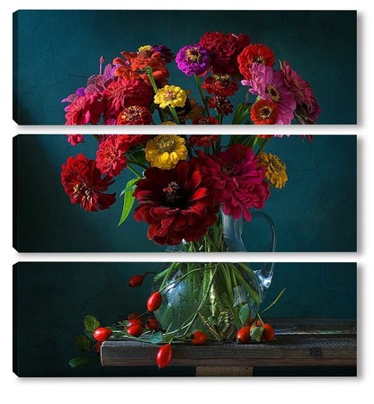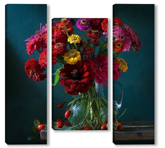 Купить модульную картину Натюрморт с цинниями, шиповником и бабочкой