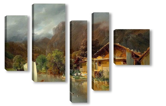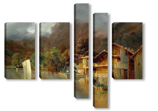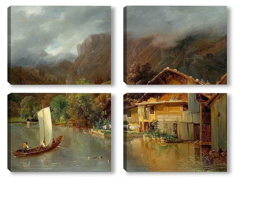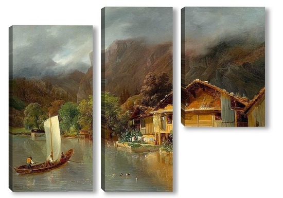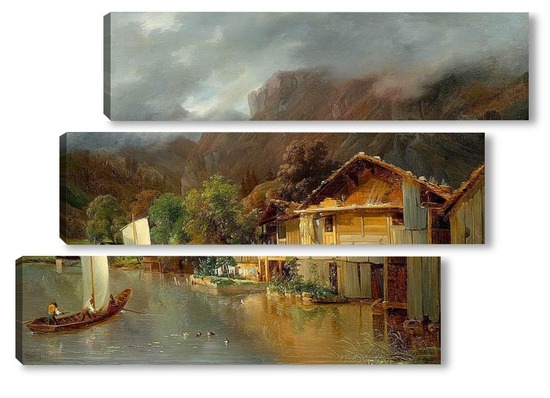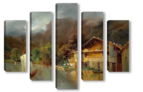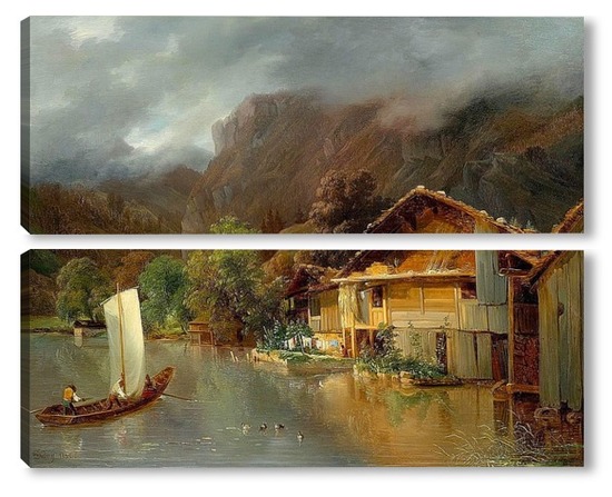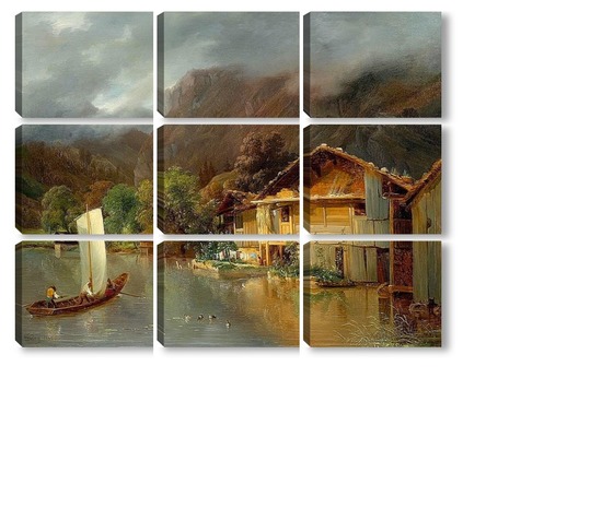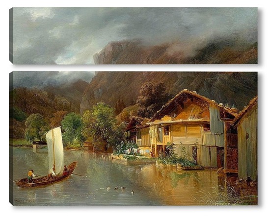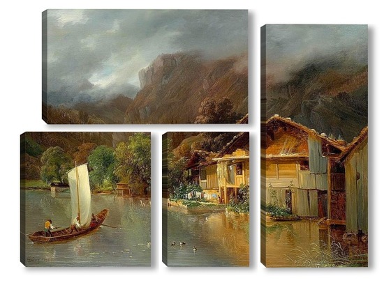 Купить модульную картину Дом на озере Бринц с лодкой и утоками, 1832