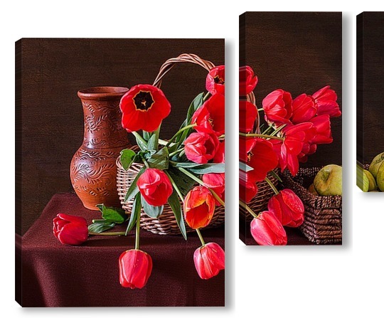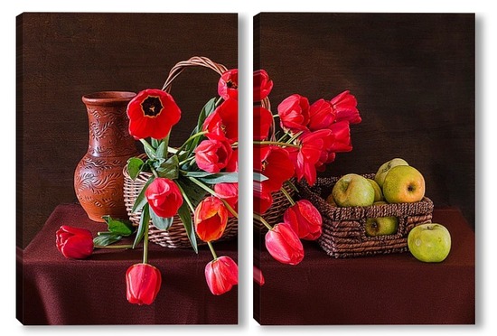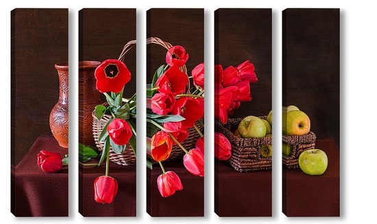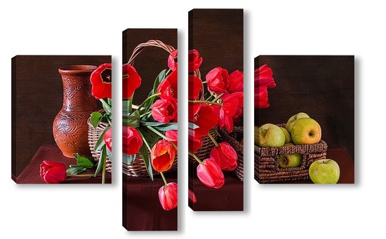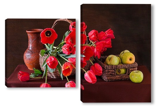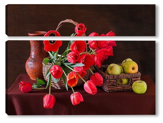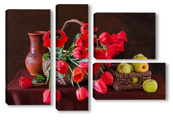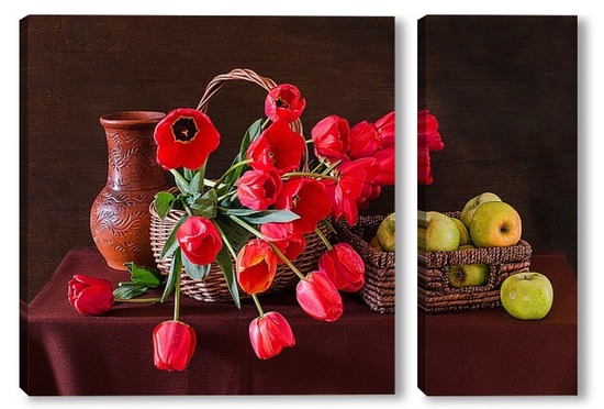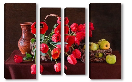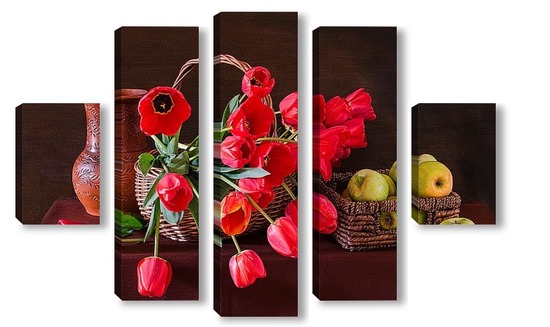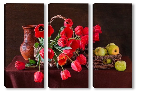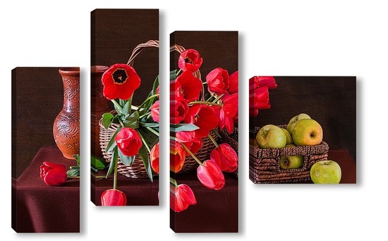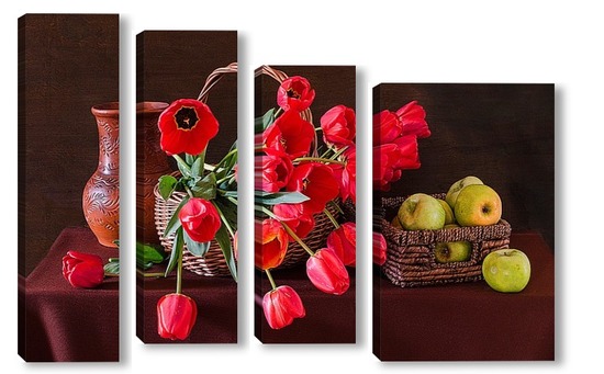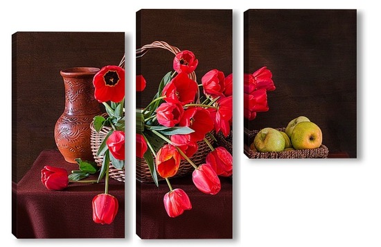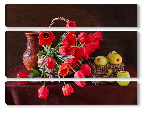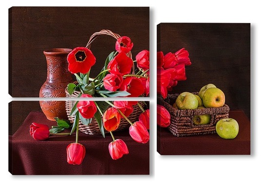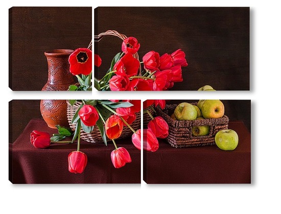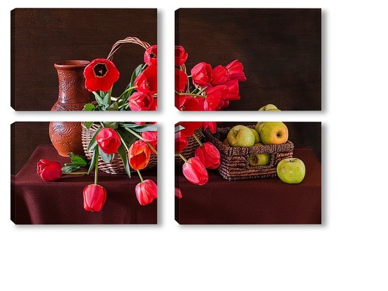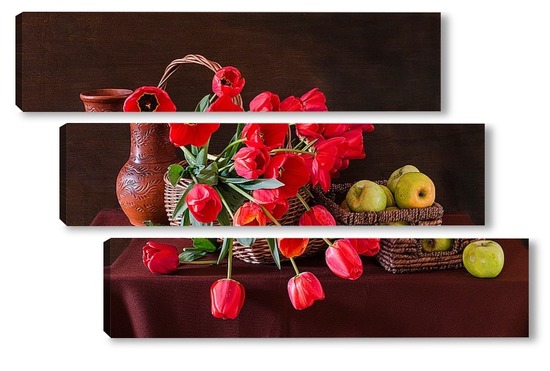 Купить модульную картину Красные тюльпаны и зелёные яблоки