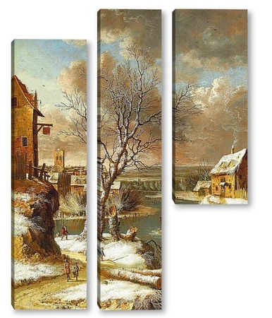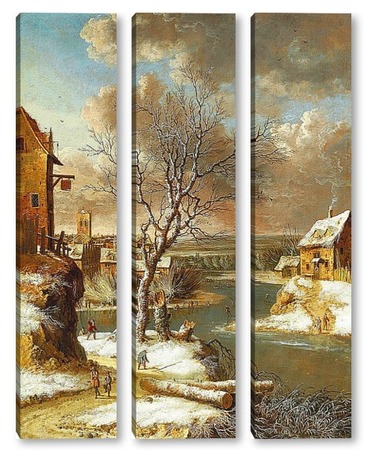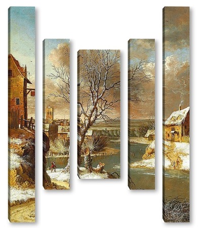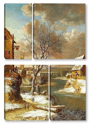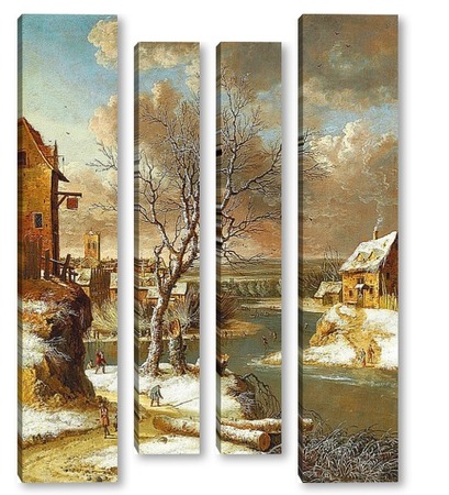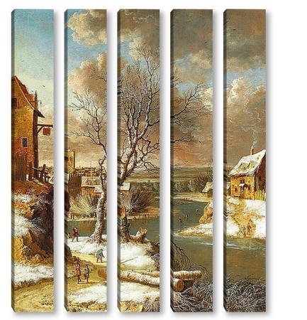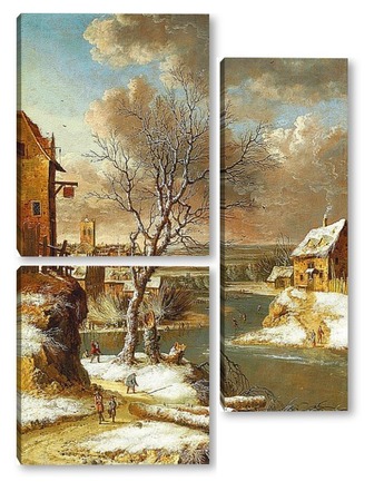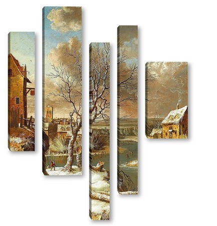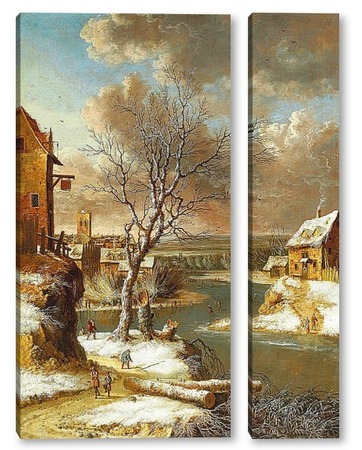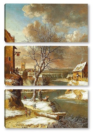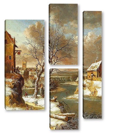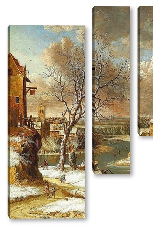 Купить модульную картину Зимний пейзаж с фигуристами на замерзшей реке