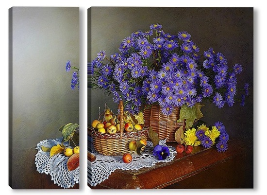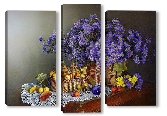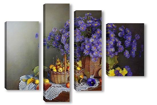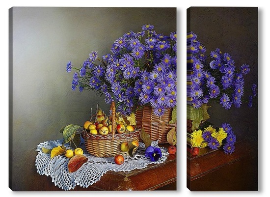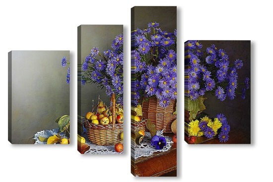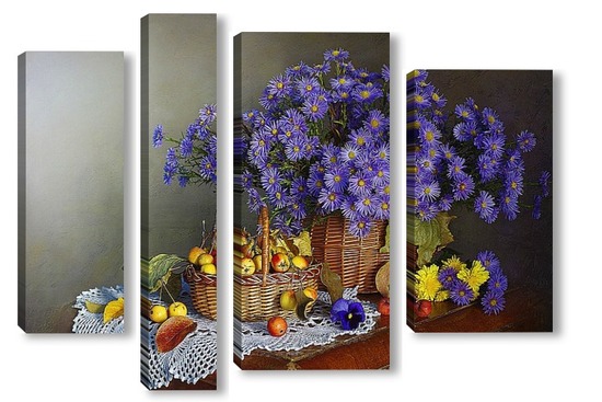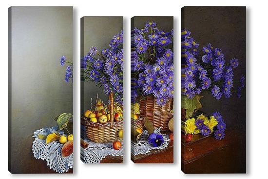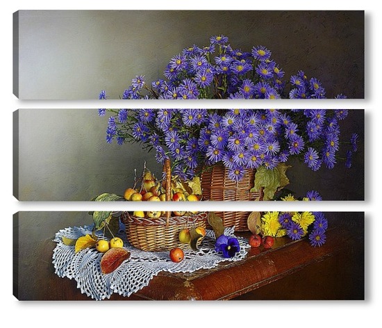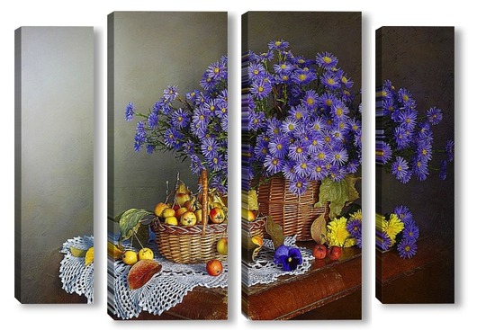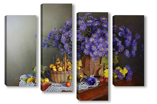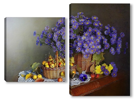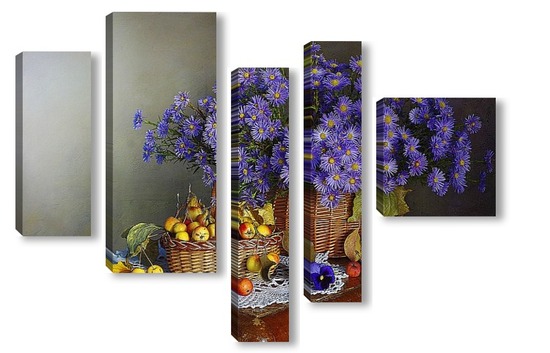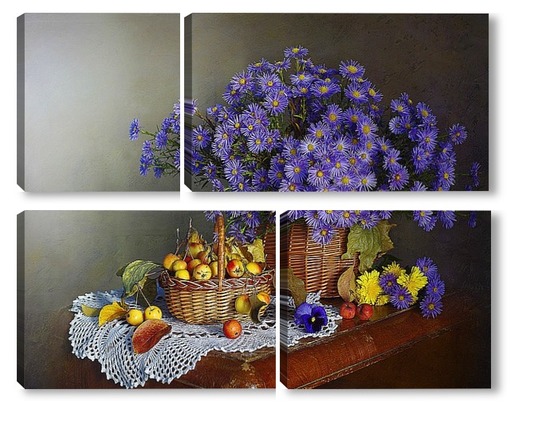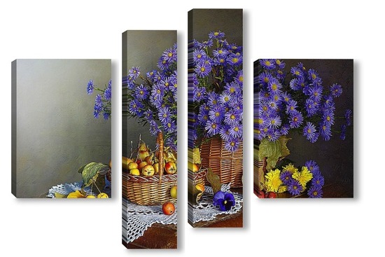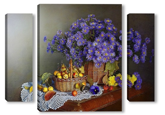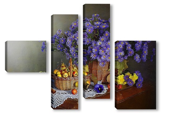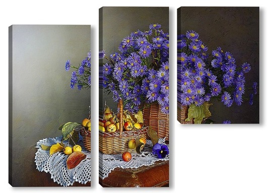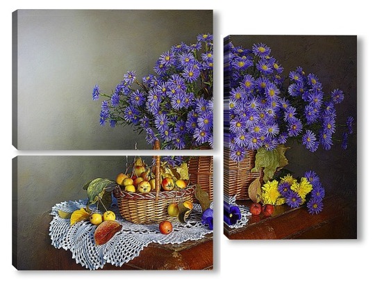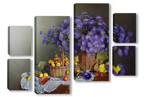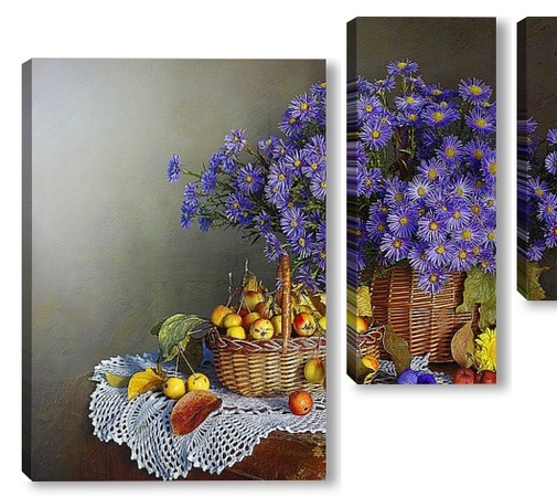 Купить модульную картину Букет голубых сентябрин и лукошко с яблоками