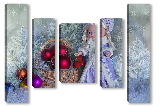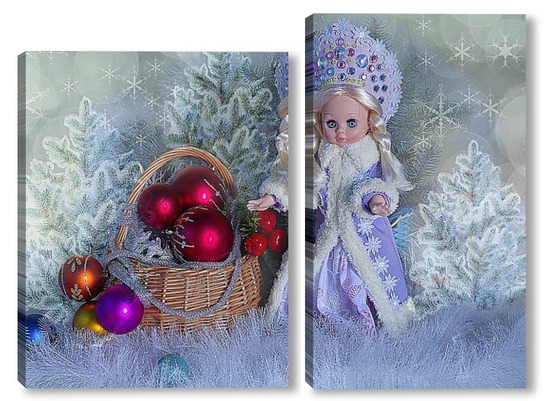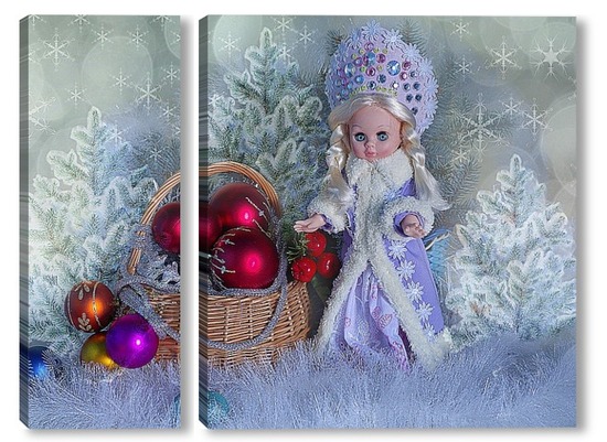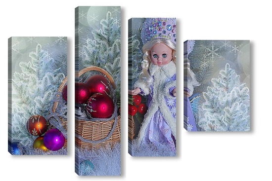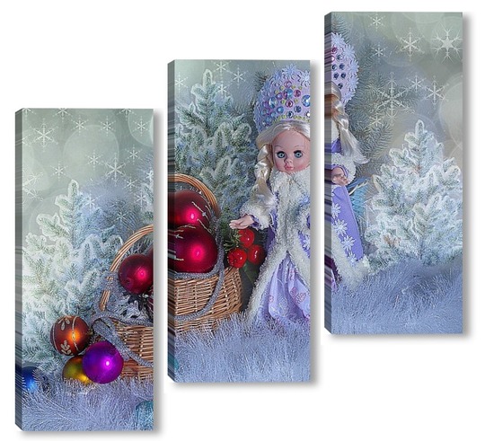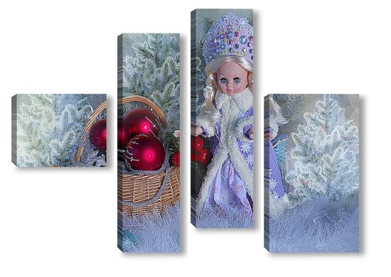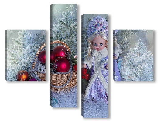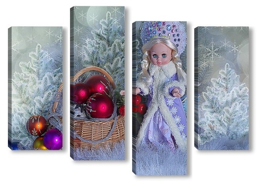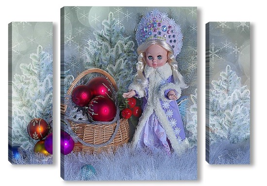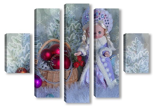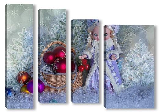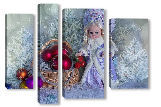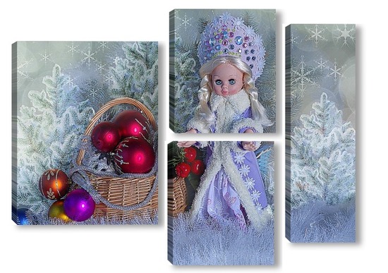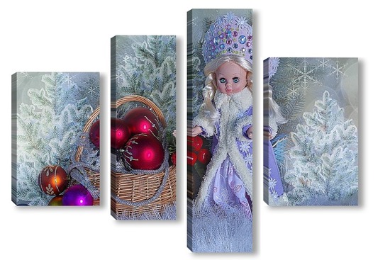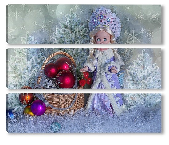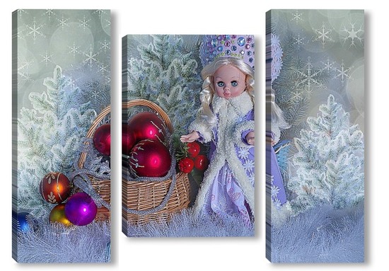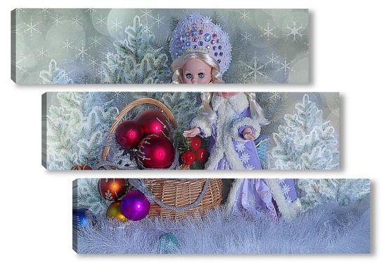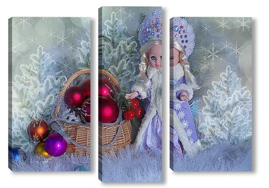 Купить модульную картину Новогоднее фото с куклой Снегурочкой и елочными шарами