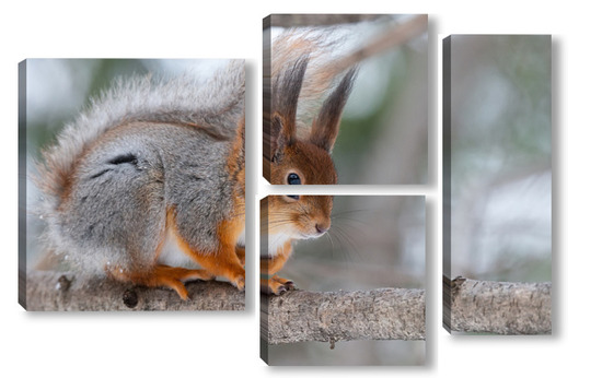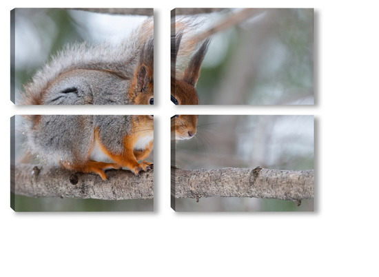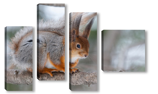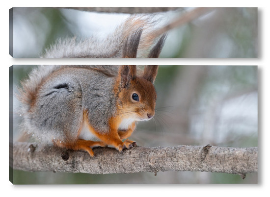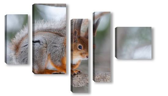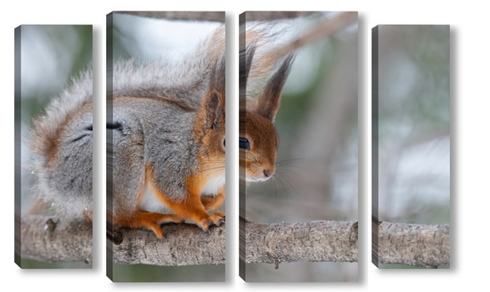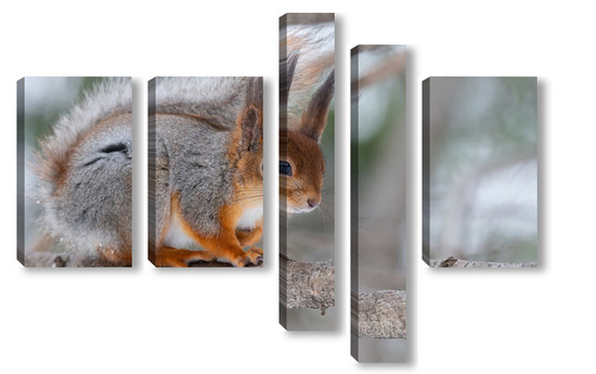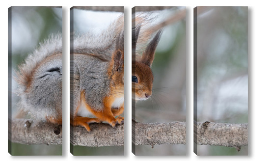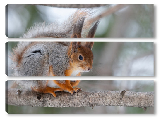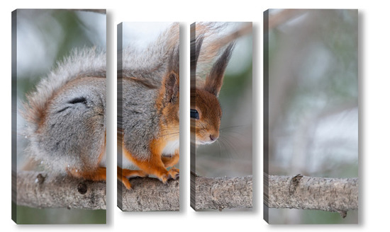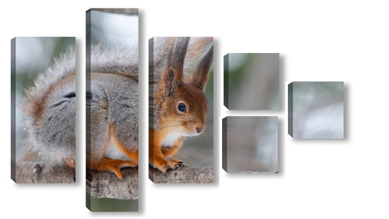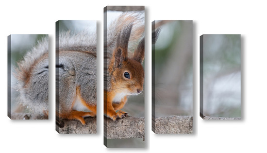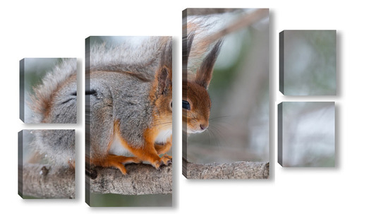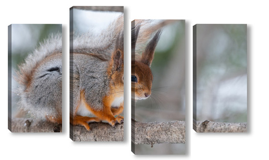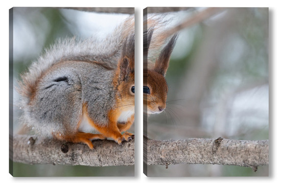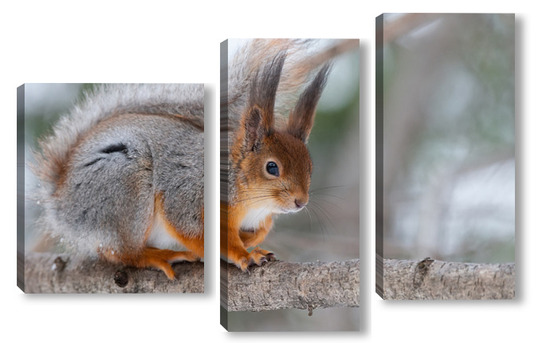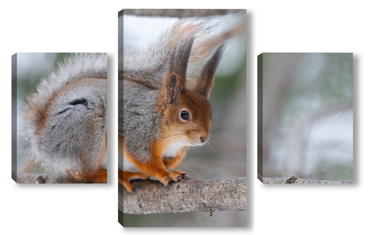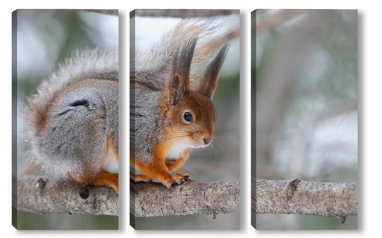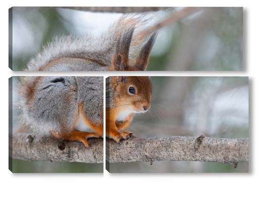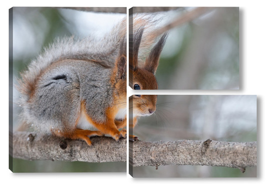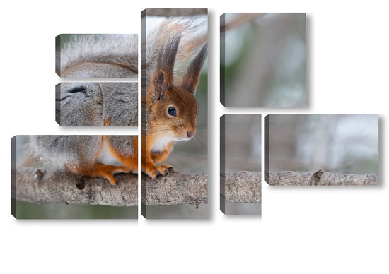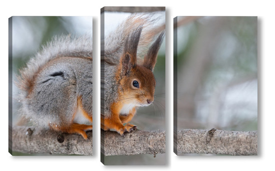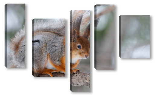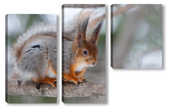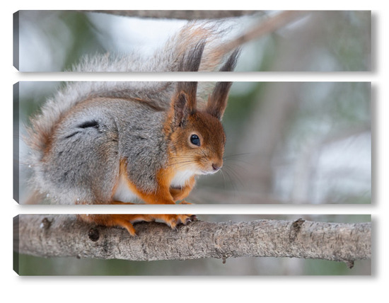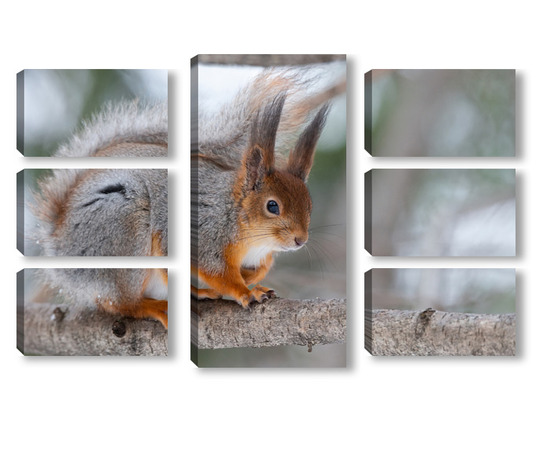 Купить модульную картину Red squirrel sitting on a tree branch in winter forest and nibbling seeds on snow covered trees background.