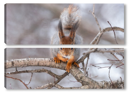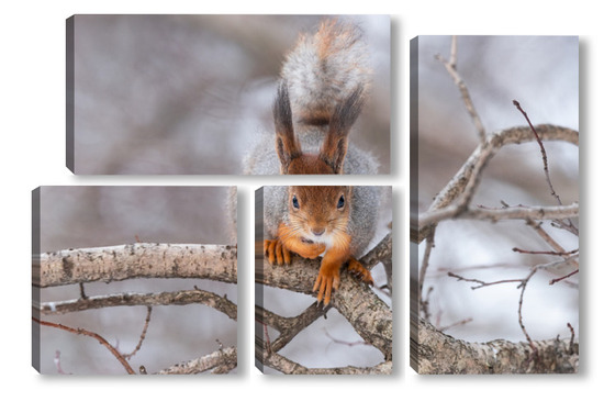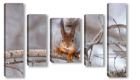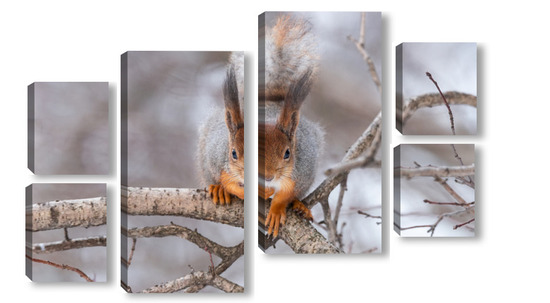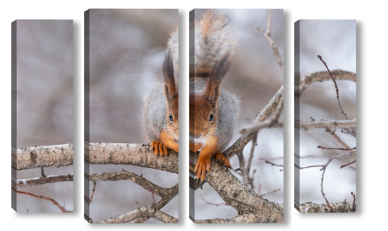 Купить модульную картину Red squirrel sitting on a tree branch in winter forest and nibbling seeds on snow covered trees background.