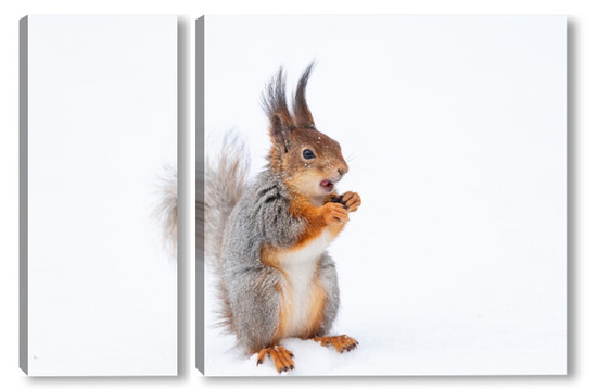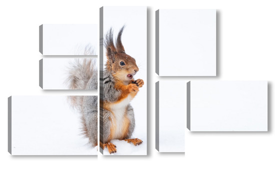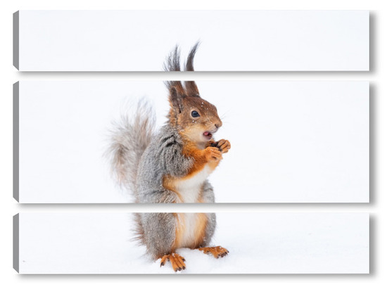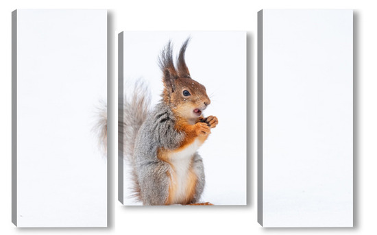 Купить модульную картину Red squirrel sitting on a tree branch in winter forest and nibbling seeds on snow covered trees background.
