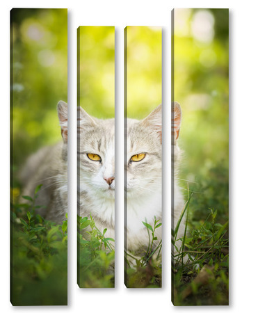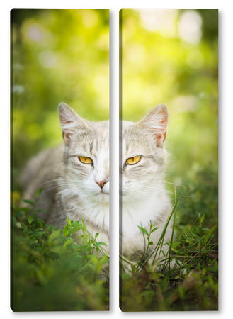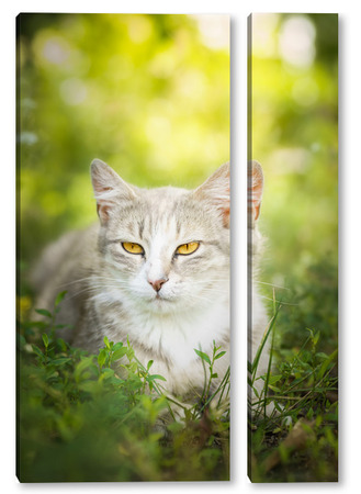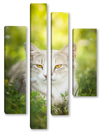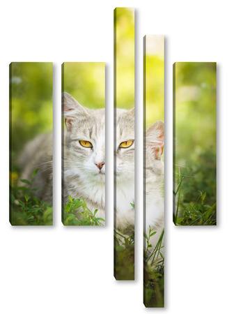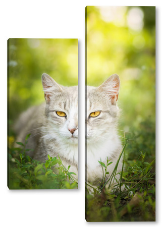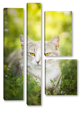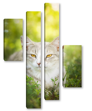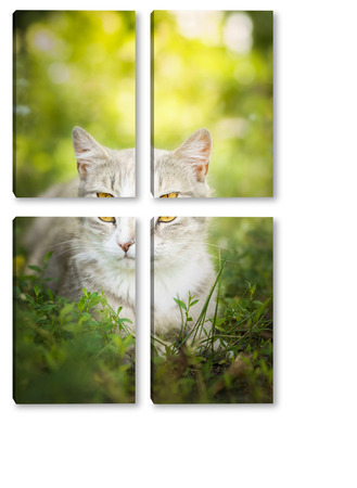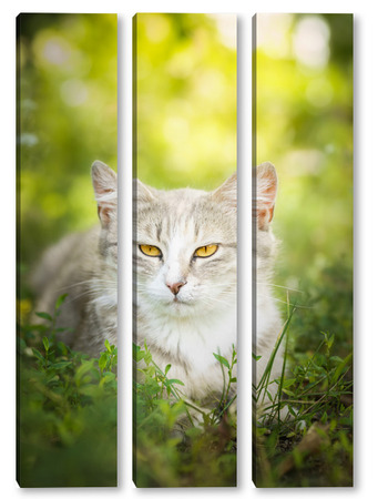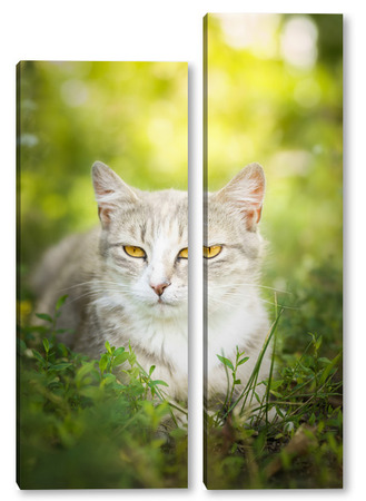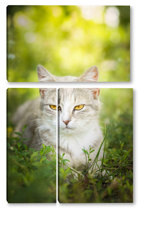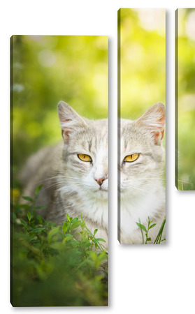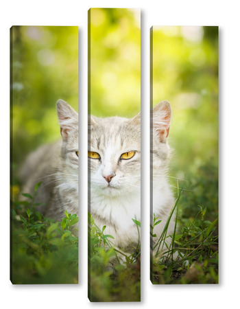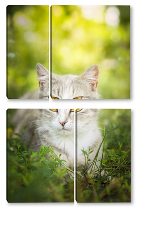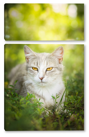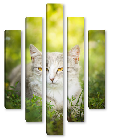Купить модульную картину Gray striped cat walks on a leash on green grass outdoors..