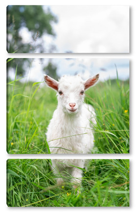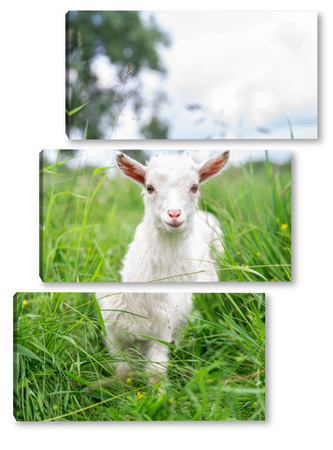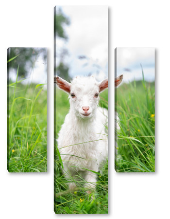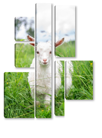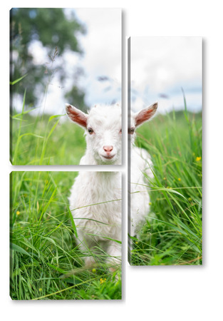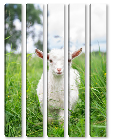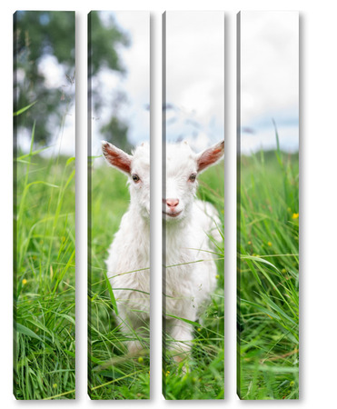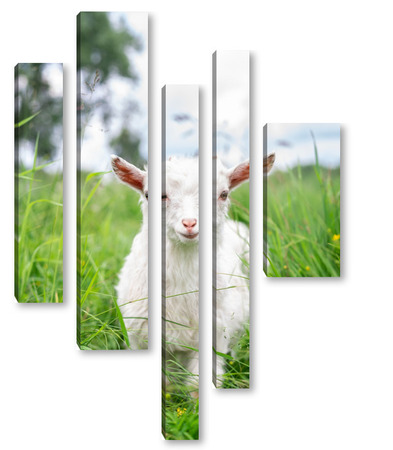Купить модульную картину Белая коза в саду ест молодую сочную траву, разводит коз