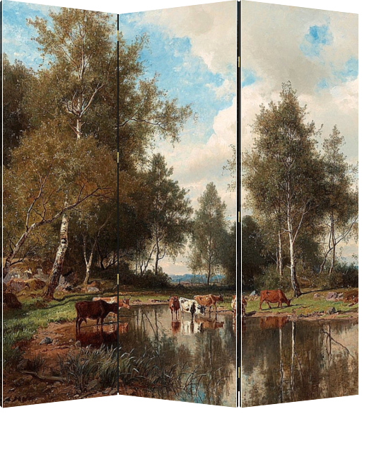 Ширма "Лесной пейзаж с березами и коровами на водопое."