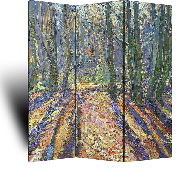 Описание ширмы Осення звонкость. Еще достаточно тепло, но день все короче и короче. Солнце уже невысоко над горизонтом. Его лучи скользят сквозь поредевший осенний лес, рисуя фиолетовые, холодноватые тени на опавшей листве. Скоро придет ноябрьская серость, ну а пок