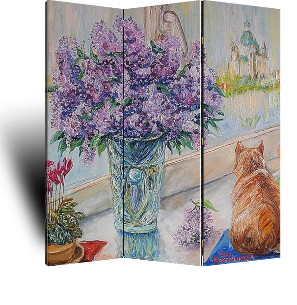 Описание ширмы Яркий весенний натюрморт с котом на окне ,цветами и фруктами оживит любой интерьер
