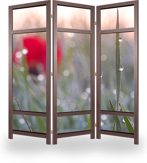Описание ширмы передний план травинки с каплями росы, на заднем плане расфокусированное изображение тюльпана чем-то напоминающего мак