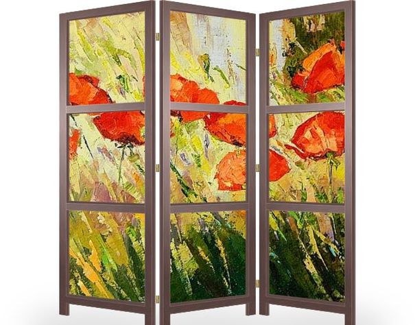 Описание ширмы Легкие маки, будто красные бабочки , качаются на ветру, трепещут, легонько качают головками взад-вперед на лугу.