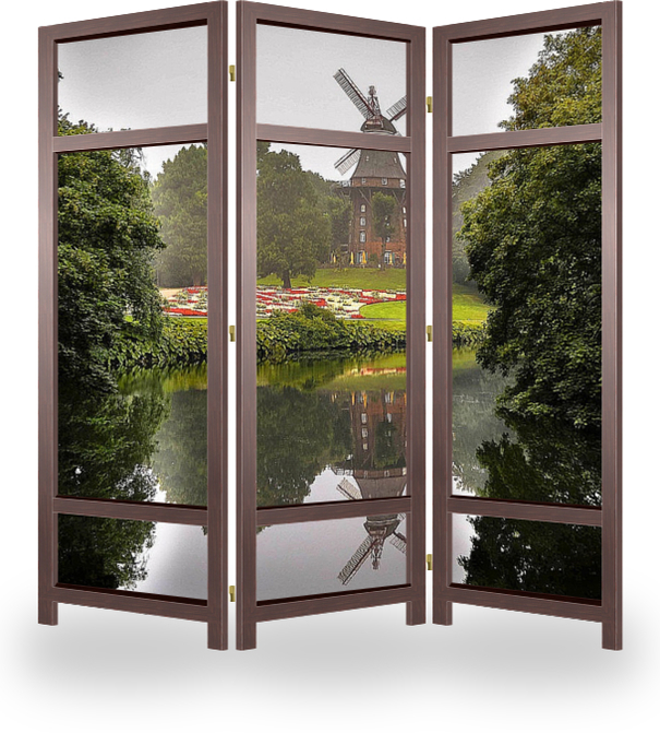 Описание ширмы Мельница на валу, расположенная в немецком городе Бремен, - единственная сохранившаяся из восьми мельниц, которые некогда находились в этой местности и принадлежали мукомольному комбинату Rolandm le. Первая мельница на этом месте была построена в 166