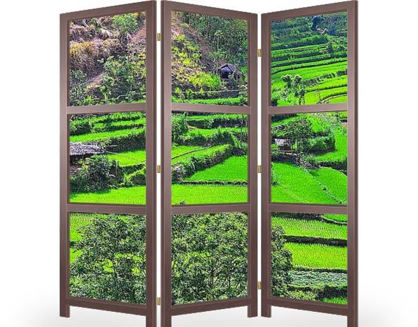 Описание ширмы Остров Бали в Индонезии известен многим своими очень живописными видами на рисовые террасы. Большинство террас расположено ближе к центру острова. Рис обладает особо насыщенным зеленым цветом
