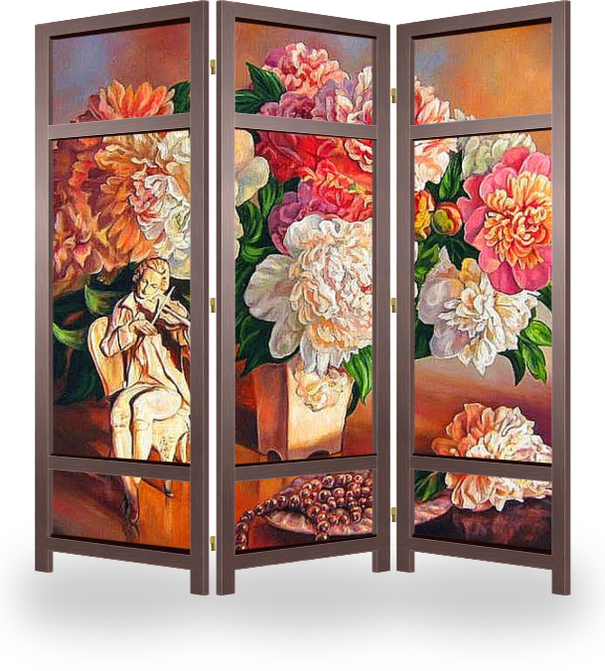 Описание ширмы Роскошный натюрморт, в сочных тонах, с кремовыми пионами чудесно впишется в дорогой интерьер гостиной или большой светлой кухни. Картина для дома, офиса, загородного дома. Картина для музыкального класса.