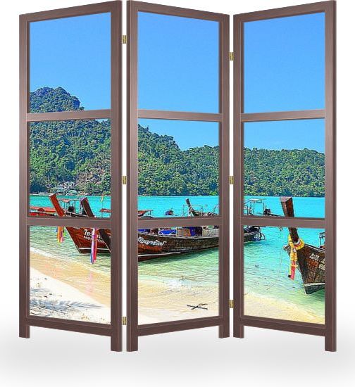 Описание ширмы На этой фотографии изображены ярко украшенные лентами лодки, характерный для этих мест транспорт, который местные жители используют обычно для перевозки туристов с острова Пхи Пхи Дон на соседний остров Пхи Пхи Лей в бухту Майя (Таиланд), где снималс