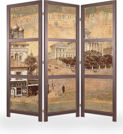 Описание ширмы Коллаж на холсте, белила, масло, сканированные старые газеты из Ленинской библиотеки, 2010 год. Серия картин создавалась для выставки в МосковскойГорДуме.