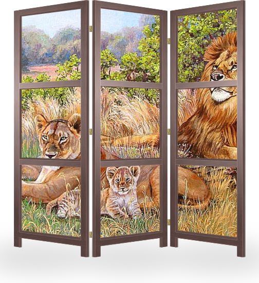 Описание ширмы Пейзаж саванны, с семейством роскошных больших кошек на отдыхе. Львиный прайд во всем своем великолепии. Картина создавалась по заказу, заказчик хотел видеть в картине именно сдержанные цвета и полутона бледной охры и мягкие оттенки коричневого, стро
