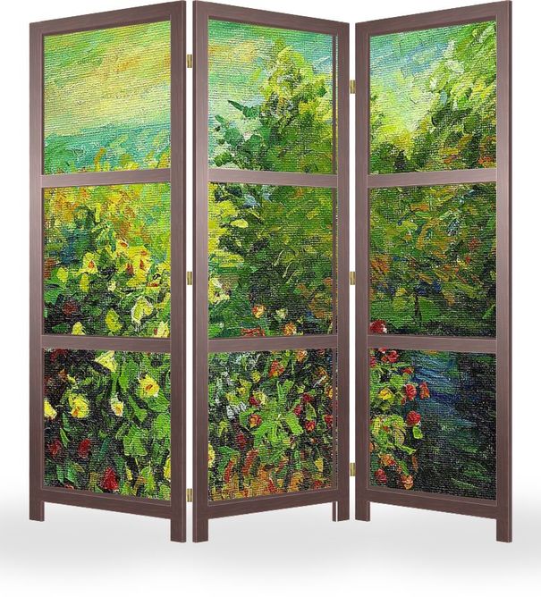 Описание ширмы авторская копия морского пейзажа французского импрессиониста Клода Моне, великолепная передача света и тени,мастерское владение колористической палитрой в изображении цветущего сада и отражением в воде пруда.