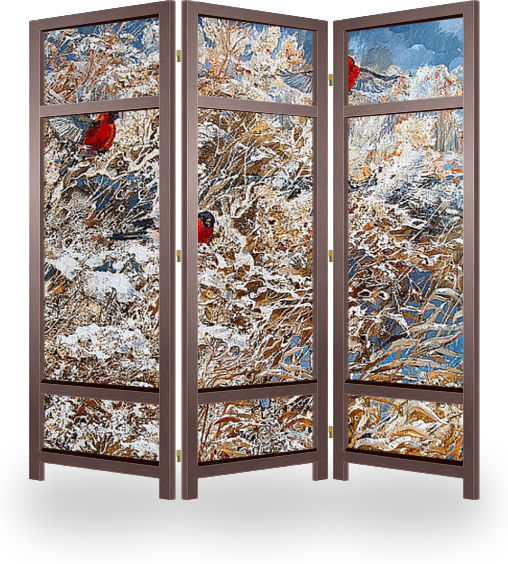 Описание ширмы Картина написана маслом на холсте. Работа создана под впечатлением от замечательной уральской зимней красоты. Картина украсит любой современный интерьер. Наполнит уютом загородный интерьер.