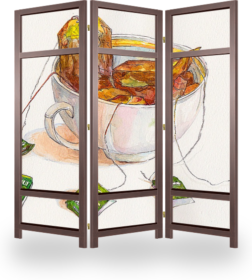 Описание ширмы У каждого художника есть слабости. Моя - черный чай. Когда я сижу за работой, могу пить его чашками по 5-6 штук подряд. Решила запечатлеть свой любимый напиток в этой иллюстрации акварелью.