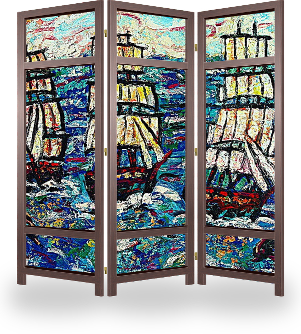 Описание ширмы Дельфиньи кольца обновили даль.Друг друга давят волны -скаты.Вот корабли,как поплавки и тросов сталь -уздечки парусов крылатых.Крик чаек. Их полёт издалека ...