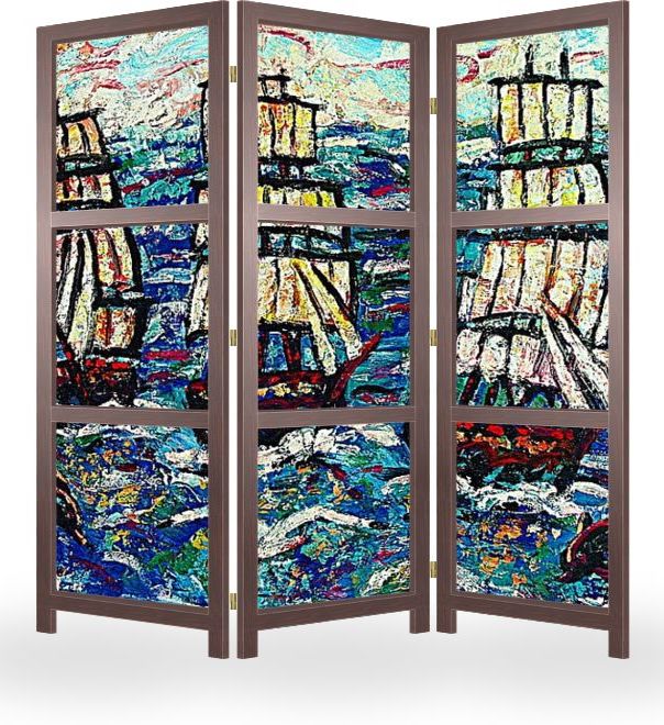 Описание ширмы Дельфиньи кольца обновили даль.Друг друга давят волны -скаты.Вот корабли,как поплавки и тросов сталь -уздечки парусов крылатых.Крик чаек. Их полёт издалека ...