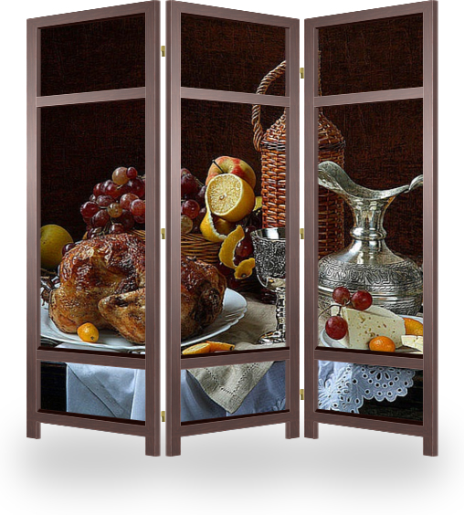 Описание ширмы праздничный ужин поданный с вином в серебрянном кувшине, на красиво сервированном столе с корзиной сочных фруктов удастся на славу, а курица гриль - главный деликатес стола