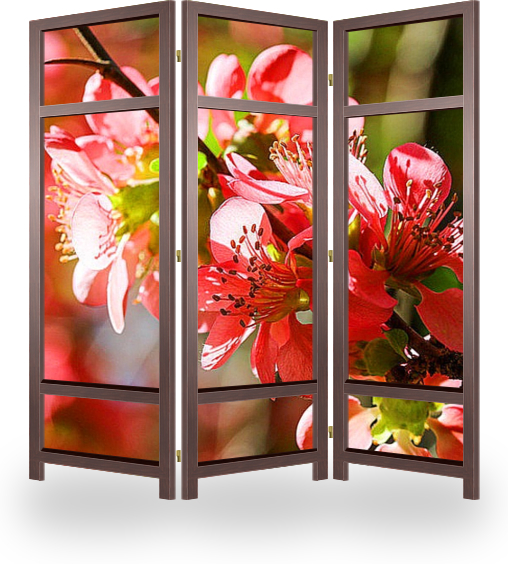 Описание ширмы Весна, яркие краски, цветущее всё, деревья и кусты проснулись после зимней спячки и радуют нас своим многоцветьем. Белый, красный, разноцветный. Привет, весна!