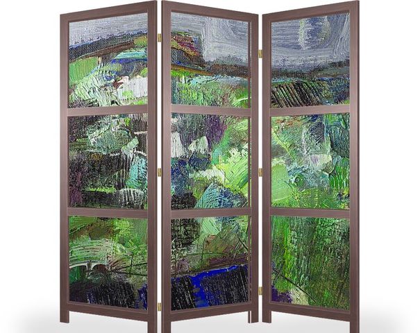 Описание ширмы натурный импрессионистический этюд выполнен на натуре в середине апреля. Задача художника была передать состояние весеннего пробуждения,робкое цветение деревьев на склоне горы,белые крыши дач и контрастом к этому чёрные заплатки вскопанных огородов