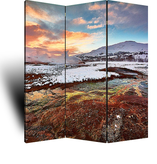 Описание ширмы Самые популярные гейзеры находятся в геотермальном регионе Исландии у реки Хвитау, около 80 км к востоку от Рейкьявика. В этом районе расположена целая система покрытых паром водоемов с горячей водой и пузы­рящейся грязью. Здесь же находит­ся Большой