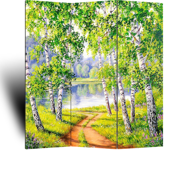 Описание ширмы Яркий насыщенный летний пейзаж, свежая зелень русских берез привлекает и зовет по тропинке к речке, а там...светлая чистота воды и прохлада тенистого леса за речкой. Пейзаж прекрасно впишется в интерьер любителя Российской природы.Место ему отыщется