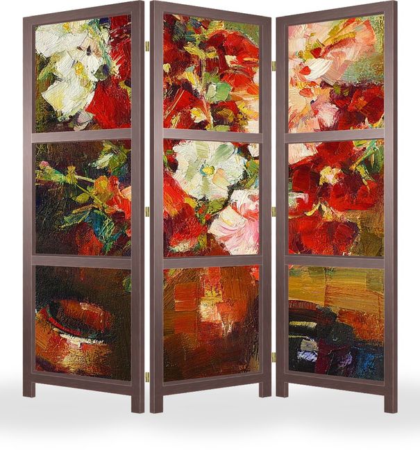 Описание ширмы авторская копия натюрморта с мальвами Николая Фешина- блистательного мастера русской живописи,особенностью творческого метода которого было широкое виртуозное письмо,одним широким мазком художник мог изобразить предмет его цвет и освещение.