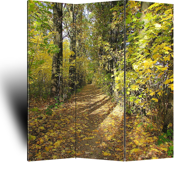 Описание ширмы Солнечный, уютный уголок осенней природы. Дорога, ведущая вдаль, дарит покой и умиротворение. Ковер из осенних листьев и солнечные блики на дороге придают особое очарование пейзажу. Чудесное фото, создающее чувство безмятежности и единения с природ