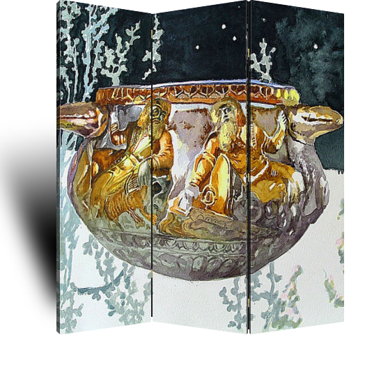Описание ширмы Акварельная картина на основе изображения антикварной вазы из скифского золотого клада 3-4 века до н.э. на фоне пейзажа ковыльных степей и черного звездного неба