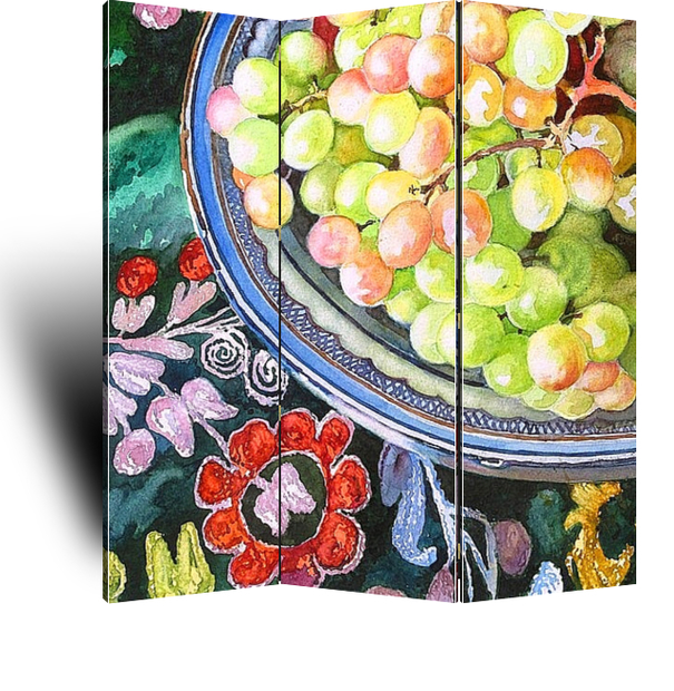 Описание ширмы Картина акварельная---солнечный виноград на керамическом блюде представляет древний образ *виноградной лозы* как символ радостей и счастья жизни, благодарности бытия