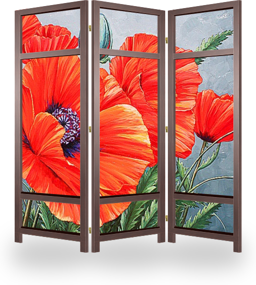 Описание ширмы Олейник Алик, " Красные маки и бабочка" холст,масло, 120 х 65 см. 2015 год. Картина писалась по заказу дизайнеров для чёрно белого интерьера, вписалась в среду идеально.