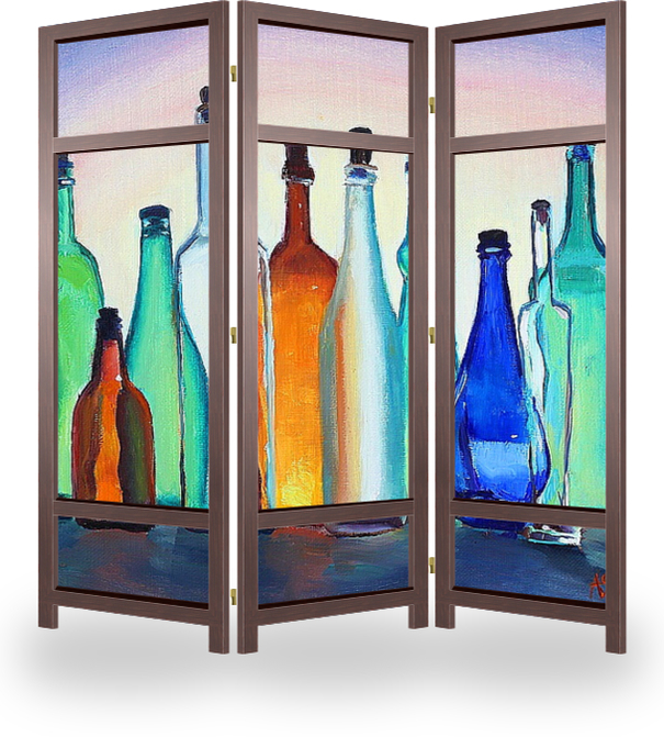 Описание ширмы Картина написана в рамках обучающего курса по технике масляной живописи, который проводит автор. Благодаря фронтовому освещению цвет бутылочного стекла усиливается. Бутылки различны по форме, цвету и фактуре стекла, линии и формы преломляются, цвета