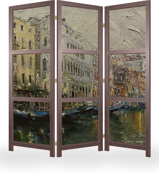 Описание ширмы Вечерняя Венеция, гондолы ровными рядами расположились на отдых, гостеприимные рестораны распахнули свои двери, настало время отдыха от дневной жары и любования вечерними огнями Венеции