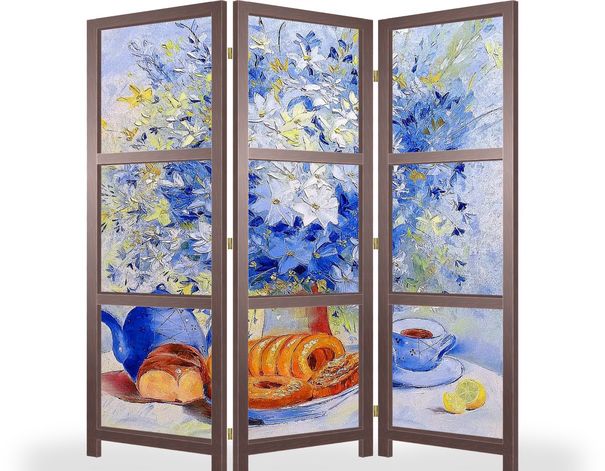 Описание ширмы На стене - часы. Кукушка Скажет мне, который час. Пью в четыре чай с ватрушкой И с вареньем каждый раз Кипяток из самовара, В чашку синюю налью. Запах мяты, кольца пара И баранки... Ох, люблю... Л. Майорова