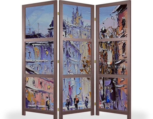 Описание ширмы Картина маслом , написана мастихином (Мастихи?н (от итал. mestichino) — специальный нож или мастерок, использующийся в масляной живописи для смешивания красок, очистки палитры или нанесения густой краски на холст. Иногда мастихин употребляется вместо