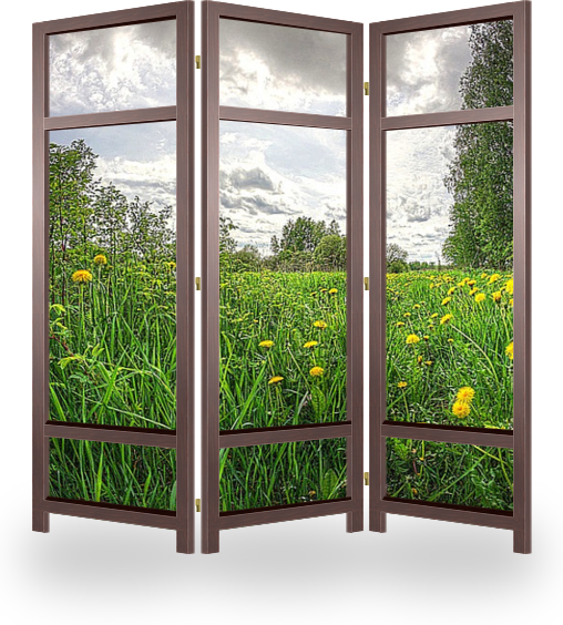 Описание ширмы Теплый весенний майский день, яркая зелень, луг, цветение одуванчиков, жужжание шмелей, пение птиц, березки, кусты шиповника, кучевые облака на небе. Приближение дождя.