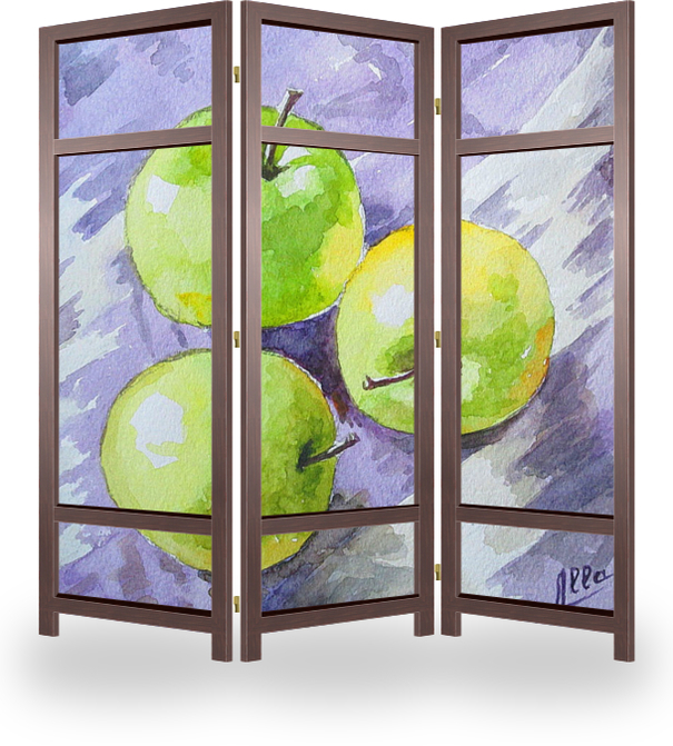 Описание ширмы Картина в акварели--три зеленых яблочка на бледно-лиловом фоне создают гармоничный образ, который в культуре многих народов символизирует любовь, здоровье и счастье. В народных сказках---*молодильные яблочки*