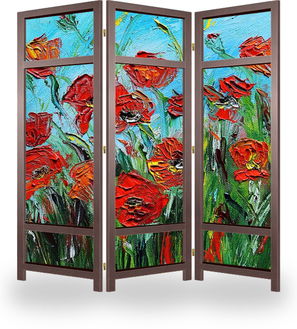 Описание ширмы Яркие прекрасные маки, от них невозможно отвести глаз... Они прожигают до самого сердца...Такой букет будет согревать вас холодными зимними вечерами. Картина притягивает взгляд. Прекрасные цветы для прекрасного интерьера. Картина наполнит ваш интерье