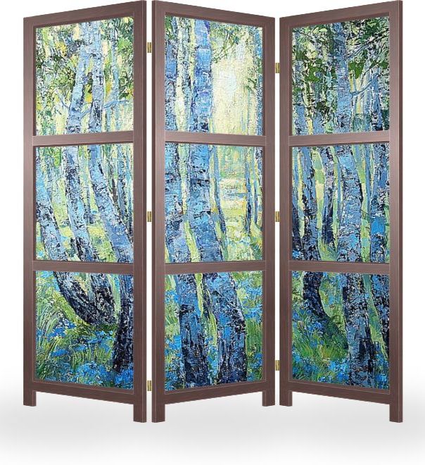 Описание ширмы Работа выполнена маслом на холсте. На картине изображен березовый лес в тот момент, когда обильно зацвели незабудки. Картина наполнит светом и теплом любой современный интерьер. Картина украсит загородный интерьер.