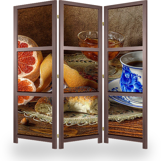 Описание ширмы Натюрморт с грейпфрутом. Сочный грейпфрут на блюдце. Чашка с чаем, расписанная под "Гжель". Чай, варенье, хлеб, орехи, ложка. Всё расположено на столешнице с гобеленовой салфеткой.